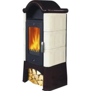 Kaminofen Kachelofen DOMOFIRE Wels Keramik cremebraun 8 kW Mit Wärmespeicher Mit Holzfach