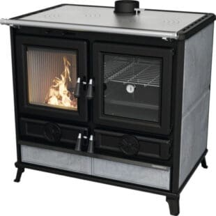 Festbrennstoffherd Westminster K85F grau Backofen links mit Stahlplatten-Kochfeld