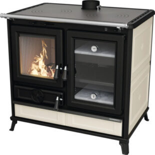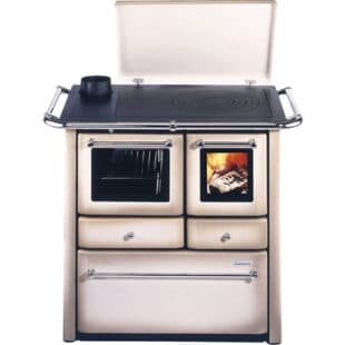 Festbrennstoffherd Westminster K85F beige Backofen links mit Stahlplatten-Kochfeld