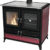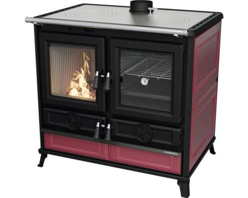 Festbrennstoffherd Thermorossi Viola Evo 12,1 kW schwarz mit Kacheln in bordeaux und Gusseisen-Kochfeld