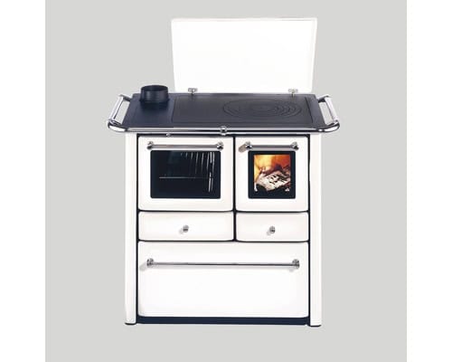 Festbrennstoffherd Westminster K85F weiß Backofen links mit Stahlplatten-Kochfeld