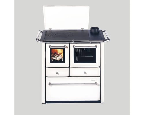 Festbrennstoffherd Westminster K85F weiß Backofen rechts mit Stahlplatten-Kochfeld
