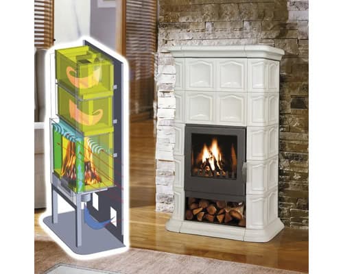 Kaminofen Kachelofen DOMOFIRE Wels Keramik weiß knochenfarbe 8 kW Mit Wärmespeicher Mit Holzfach