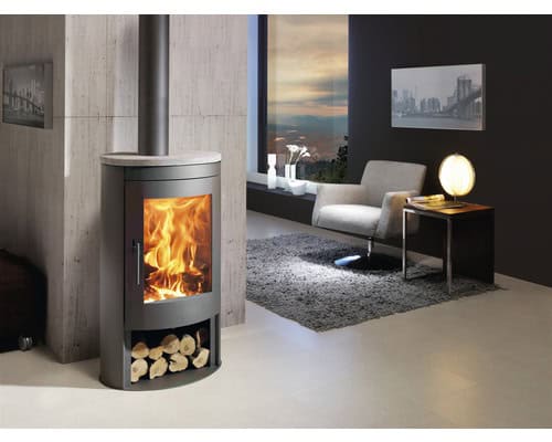 Kaminofen Panadero Oval 1 Stahl schwarz 8,7 kW mit Natursteinabdeckung und Holzfach